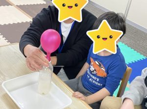「スライムが出来るんじゃない?」と予想してくれたお友達がいましたが、いざ実践してみると、ペットボトルの中に二酸化炭素が発生し、その力で風船がムクムクと膨らみました