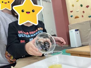 続いて2つ目は、プラスチックのカップに重曹・水・食器用洗剤・絵の具を入れて混ぜ、そこに酢を加えるとどうなる?というものでした。