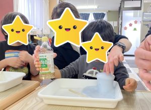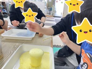 「シャボン玉が出来る!」と予想してくれたお友達もいましたが、やってみると一気にモフモフの泡ができ、みるみるうちにカップから溢れる様子に大興奮のみんな![]()
