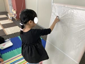 いつもはご飯を食べたり制作をしたりして使う机にビニールシートを貼って立てたら、大きなキャンバスの完成!