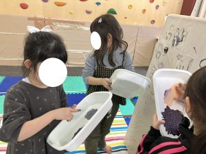 それぞれにトレーを渡し、好きな色の絵の具を入れて指で混ぜたら準備はOK⭐
