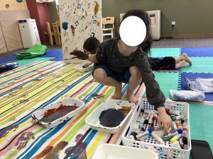 お絵描きが楽しくなると、足裏にも絵の具を塗ってスタンプ遊び!最後にはのびる粘土を出して、色をつけて遊びました(^○^)