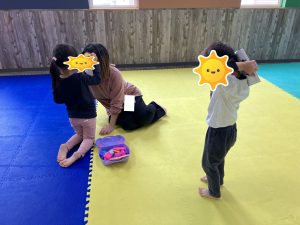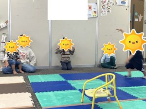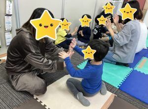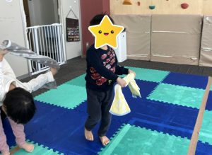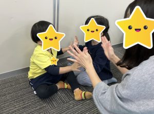 一見すると簡単そうですが、音楽のリズムにのり、且つお友達とも息を合わせる必要があるため、よく聴いて相手と動きを合わせる練習になります。なぜかこれをやるとみんなニコニコで楽しい気持ちになるので、お家でもよかったらやってみて下さいね