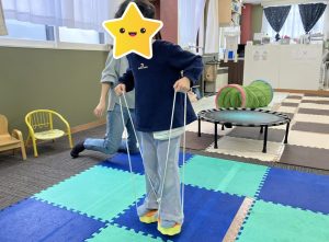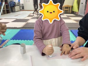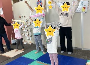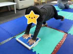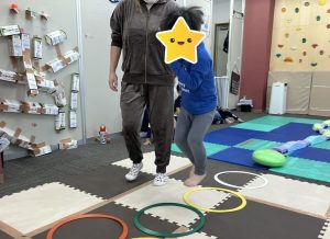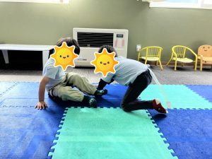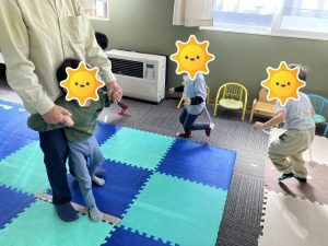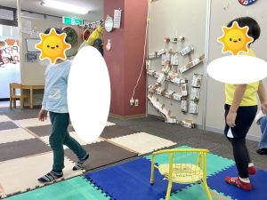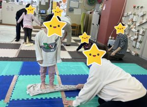 上手に出来なくてもゆっくりスタッフが動かしながら見せたり、「右手はこっちだよ✋」と具体的な指示を伝えたりすることで、体をたくさん使うことが出来ていました(^○^)