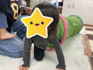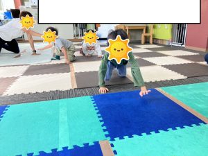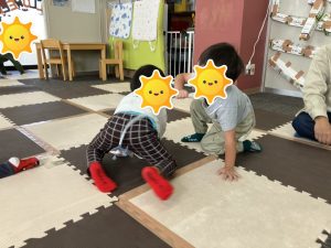 しっぽを取られても、まだしっぽが付いているお友だちが残っていれば続けてもいいというルールで行い、ハイハイから立ち上がろうとしてしまう場面もありましたが、意識しながら取り組んでいました👏