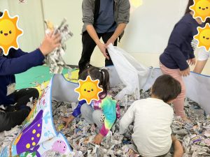 系列事業所のウェルネスにお伺いし、ウェルネスのお友達と一緒に新聞紙プールをして遊びました😊