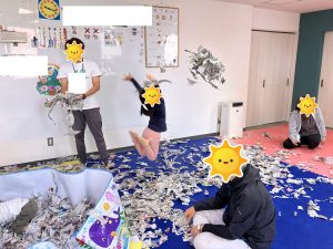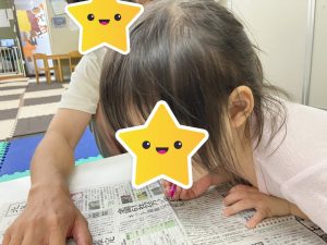 午後は新聞紙を1人ずつ渡しスタッフが言ったひらがなを探す、ひらがなみっけ!を行いました😊