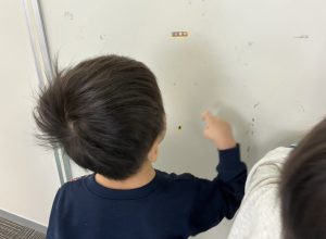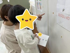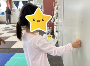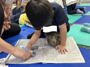 ホワイトボードに字を書き、「この字を探して見つけたら印を付けてね!」と伝えると、皆んな小さな字を見ながら一生懸命探してくれました👏‼️