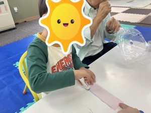 今回の制作は、ここは谷折りだけどこっちは山折り、ひっくり返さないと上手くいかない!等々、スタッフの話をよく聞いていないと上手くいかないことがたくさんでしたが、時折「大切な話をするよー!」と声を掛けると、手を止めスタッフの顔を見て話を聞くことが出来ていました🥰