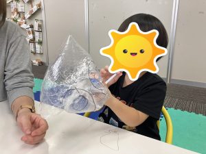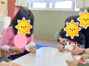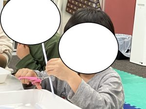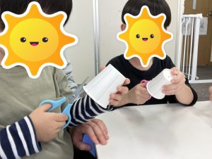 紙コップに描かれている線を切ってもらいましたが、切り過ぎると上手くいかなくなってしまうので、気を付けるポイントを伝え挑戦してもらいました(^○^)/
