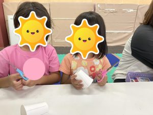 トイレットペーパーの芯に折り紙を巻き付けていく作業では、みんなとっても上手に出来ていました👏