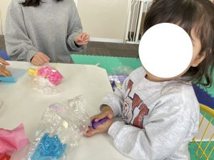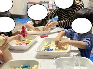 おにぎりやお団子、お寿司などたくさんの食べ物を作ったり、ひたすら感触を楽しみながら遊んだりしていました(*^^*)
