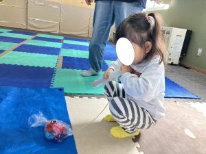 かわいいお魚が完成すると、ラップの芯で作った釣り竿に繋げてブルーシートの海に泳がせました