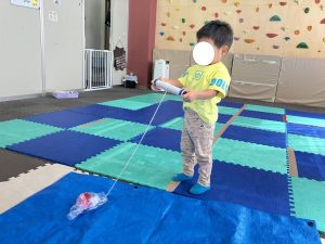 ラップの芯をクルクルと動かし毛糸を巻き取っていくと、お魚がだんだん近づいてきて最後はお魚ゲットです「やったー釣れた」と大喜びで繰り返し楽しんでくれました