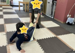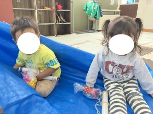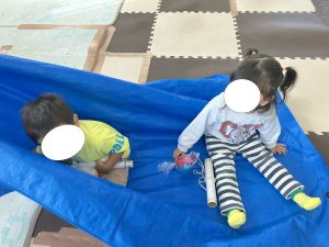 オマケで、「みんなで海のお散歩に行っちゃおうか」と、ブルーシートに座ってもらい、そのシートを引っ張ったり揺らしたりして遊びました😊