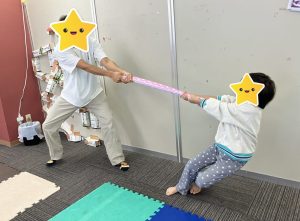 スタッフとタオル綱引きをした時は、体をしっかり支えて力を入れることが出来ているかが大切!大人に負けじと必死に引っ張っていました(◎_◎;)