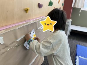 それぞれ自分のお名前のひらがなシールと、食べ物やキラキラ等のイラストシールをが貼ってある台紙を持ち、室内の色々な場所に隠れている同じシールを探してマッチングしてもらいました👏