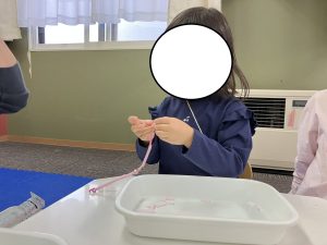 自分達でストローをはさみで切ってもらい、モールに通してブレスレット作りをしました✂